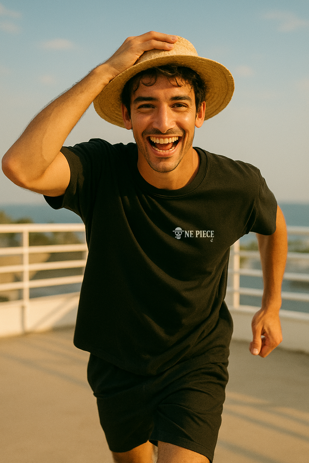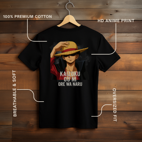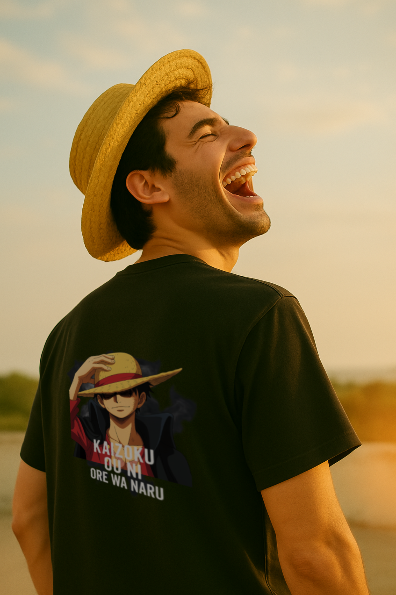 - Iconic Design – Minimal front with the original One Piece logo, and a powerful back print of Luffy’s legendary straw hat pose with the quote “Kaizoku oni ore wa naru”.